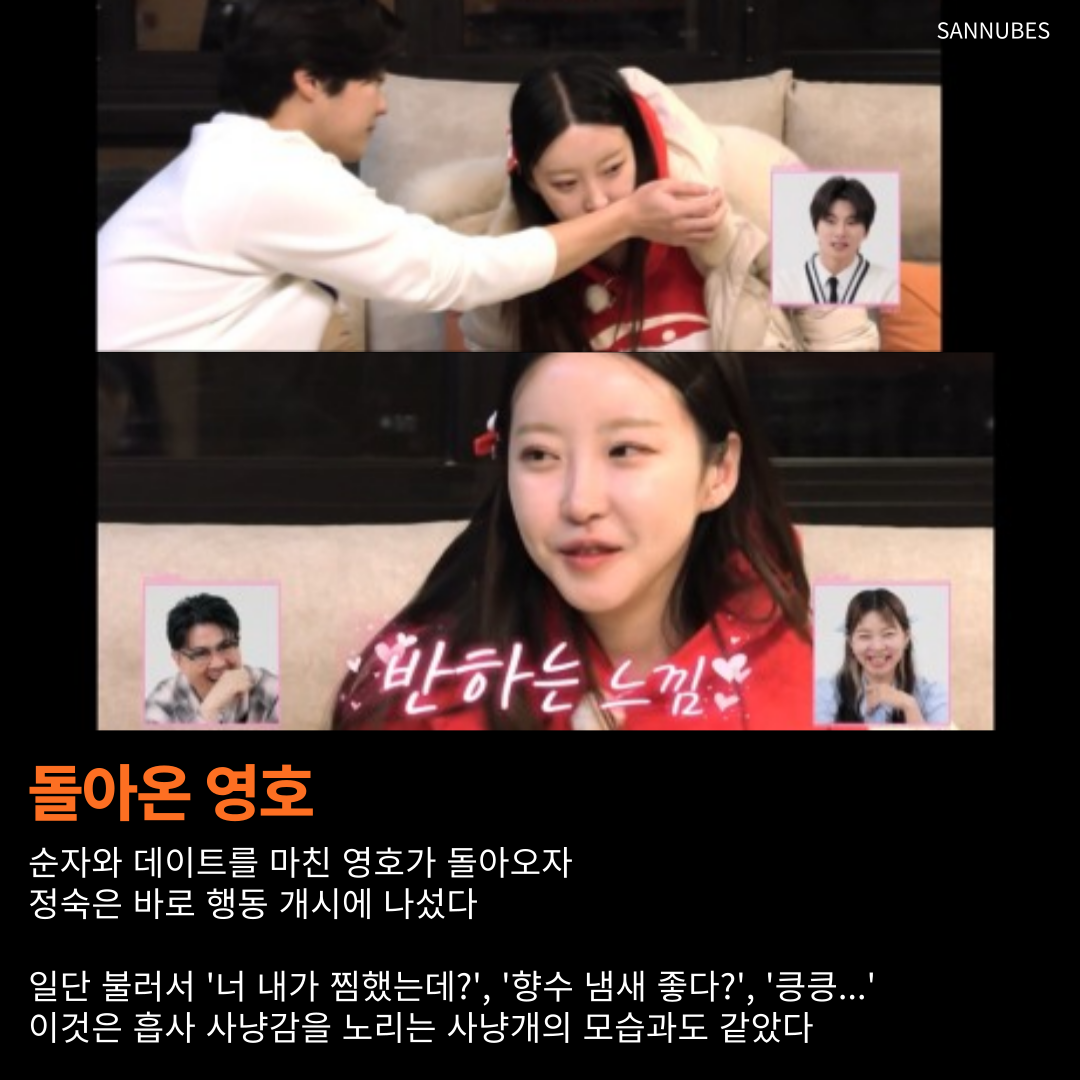 영호가 순자와 데이트 후 돌아오자, 바로 정숙은 작전을 시작했다. 대놓고 부르더니 '내가 너 찜했는데?'라고 직접적으로 말을 했고, 향수 냄새를 맡는다면서 스킨십을 하고, 대놓고 '반하는 느낌'이다라는 워딩을 했다. 이 여자 진짜 보통이 아닌 게 느껴지는 모습이다.