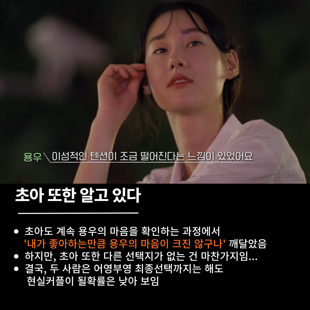 초아 또한 이 상황을 대략 인지하고 있었다. 하지만, 초아와 용우는 서로 외에는 선택지가 없다. 너무 확고하게 보이기 때문에 다른 사람이 초아와 용우를 지목할 수도 없고, 초아와 용우가 다른 사람을 지목하는 것도 힘든 일이기 때문이다.