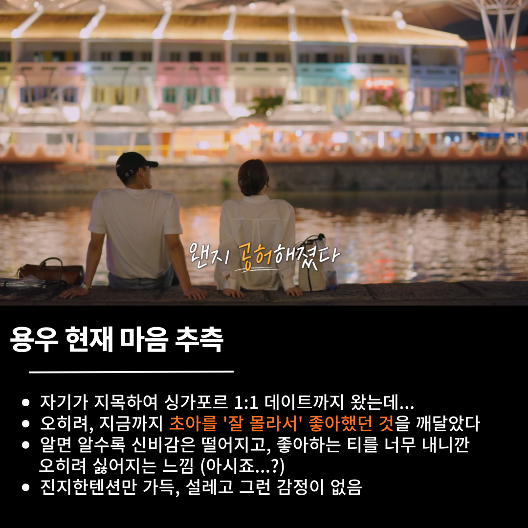 계속 반짝거렸던 용우의 눈은 동태눈이 되었다. 내일 또 초아와 데이트를 할텐데, 딱히 기대감이 보이지 않았다. 처음 싱가폴로 향할 때와는 사뭇 다른 모습이다. 둘이 싱가폴 갈 때만 해도 사귀는 줄 알았다.