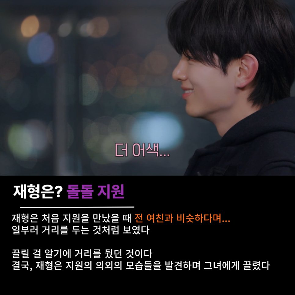 재형은 첫 만남부터 지원을 밀어내는 게 느껴졌다. 일부러 거리를 뒀고, 그녀를 '전 여친과 비슷하'라고 평했다. 하지만, 지원의 노래를 듣고 의외의 모습을 발견했고 지원이 궁금하기 시작했다. 역시, 처음에 느꼈던 예상은 틀리지 않았었다. 결국, 재형은 지원에게 끌릴 운명이었던 것 같다.
