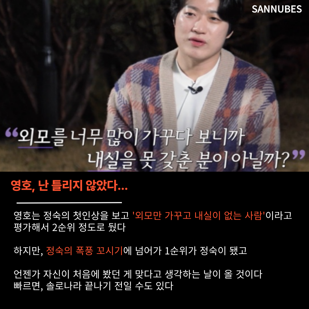 원래 영호의 1순위는 순자였지만, 정숙의 적극적인 접근과 스킨십에 판단력이 흐려졌습니다. 인터뷰에서 영호는 정숙이 외모를 너무 가꾸다 보니 내실이 부족하지 않을까 의문을 제기했습니다. 곧, 영호는 자기가 처음 본 게 맞구나 깨달을 날이 올 것입니다.
