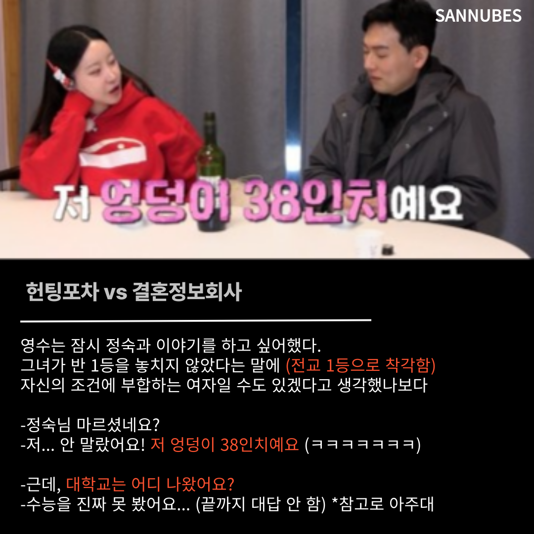 정숙은 엉덩이 사이즈 38인치라며 대화를 시작했지만, 영수는 당황하지 않고 침착하게 학력에 관한 질문을 이어갔습니다. 정숙이 전교 1등을 놓치지 않았다고 말하자 영수는 어느 대학을 다녔는지 물었지만, 정숙은 수능을 잘 보지 못했다고 대학을 공개하지 않았습니다. 이로 인해 두 사람의 대화는 진전되지 않았습니다. 정숙은 영수를 남자로 느끼지 않는다고 인터뷰에서 밝혔습니다. 영수 역시 정숙을 마음속에서 아웃시켰을 것으로 보입니다.