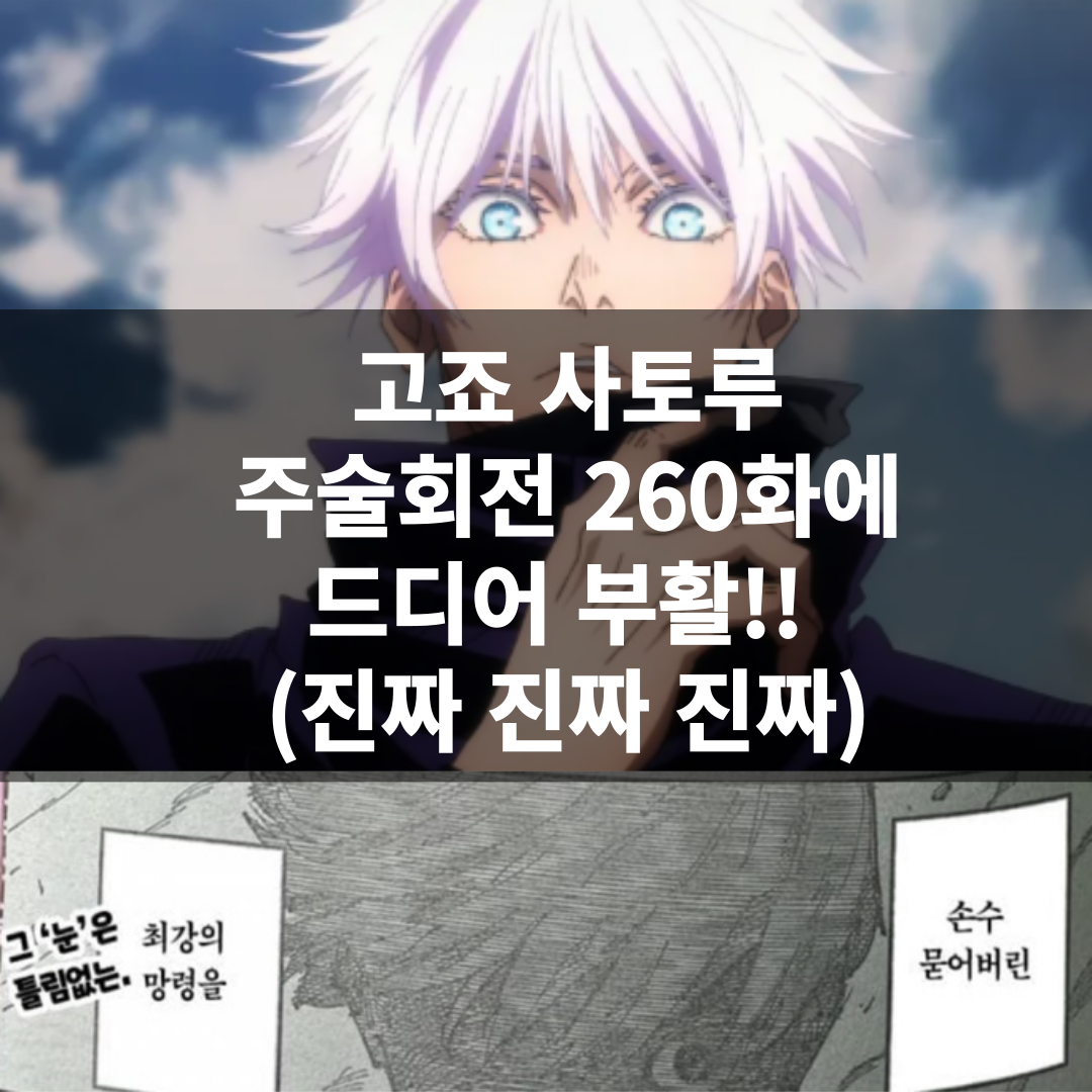 이번엔 진짜다. 주술회전 260화에서 고죠 사토루가 부활했다. 소문만 무성하던 고죠 사토루가 드디어 등장했다. 다음 편에서는 고죠 사토루의 모습을 볼 수 있을 것 같다. (이미지에서 아래에 있는 '최강의 망령을...'이 부분이 고죠 사토루)