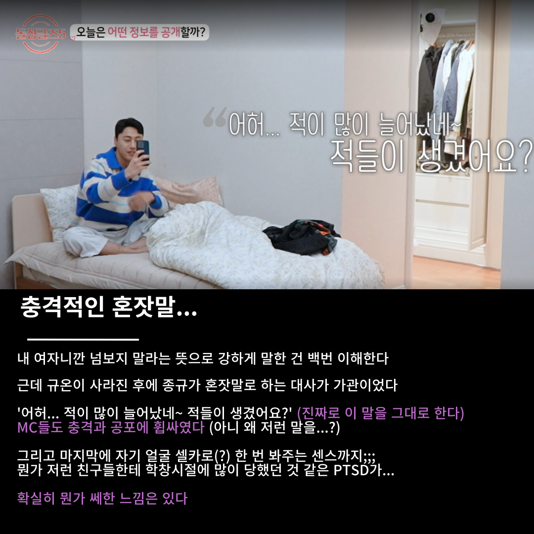 카메라가 돌아가는 걸 알면서도 혼자 킥킥대며 '적이 많이 늘어났네? 적들이 생겼어요?'라고 중얼거리는 종규를 보고 깜짝 놀랐다. MC들조차도 소름 돋는 분위기였다. 혼잣말, 중2병스러운 대사, 비웃음 섞인 웃음, 그리고 자신의 얼굴을 셀카로 보는 모습까지, 뭔가 석연치 않은 느낌이 강하게 들었다. 과연, 종규는 앞으로 어떤 행동을 보여줄지 궁금하다.