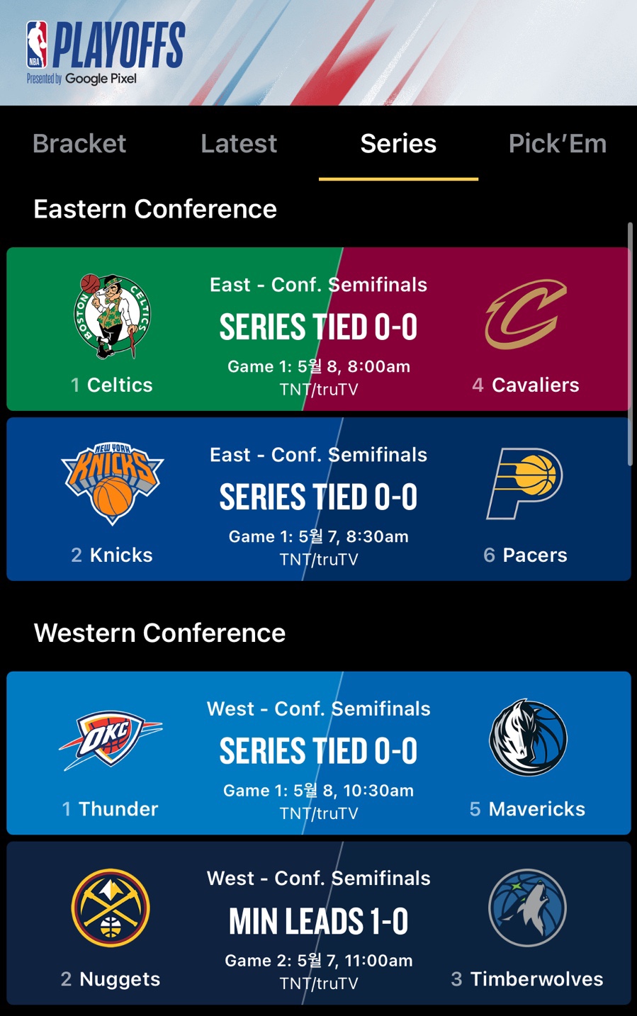 NBA의 꽃, 플레이오프가 이제 2라운드에 돌입했습니다. 8팀만 남아서 진정한 우승후보들끼리의 팽팽한 접전이 벌어지는 때입니다. 미네소타-덴버, 보스턴-클리블랜드, OKC-댈러스, 뉴욕-인디애나 네 개의 매치업을 요약해 보겠습니다.